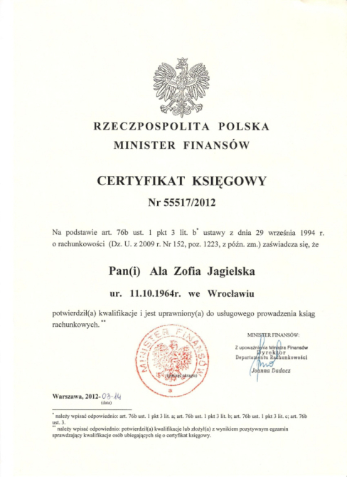 W rzeczowy i wyczerpujący sposób udzielamy wszelkich niezbędnych informacji, jednocześnie odpowiadając na wszelkie mogące się pojawić pytania. Gwarantujemy bezpieczeństwo świadczonych usług i co istotne w prosty sposób można je zamawiać przez 24 godziny na dobę za pośrednictwem strony naszego serwisu. Pragniemy podkreślić, że jako biuro rachunkowe we Wrocławiu posiadamy Certyfikat Ministra Finansów na odpłatne świadczenie usług księgowych.